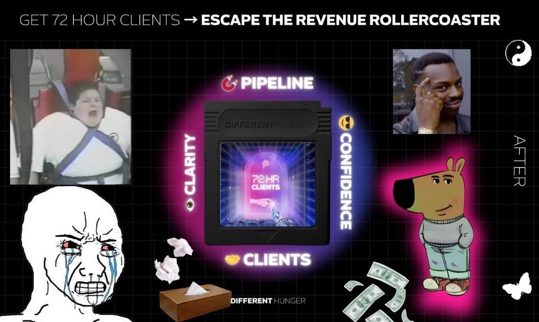 This combined with my experience of serving 300+ Studio clients and learning from my community of 10,000+ freelancers, agencies and founders through Different Hunger is why I built 72 Hour Clients.